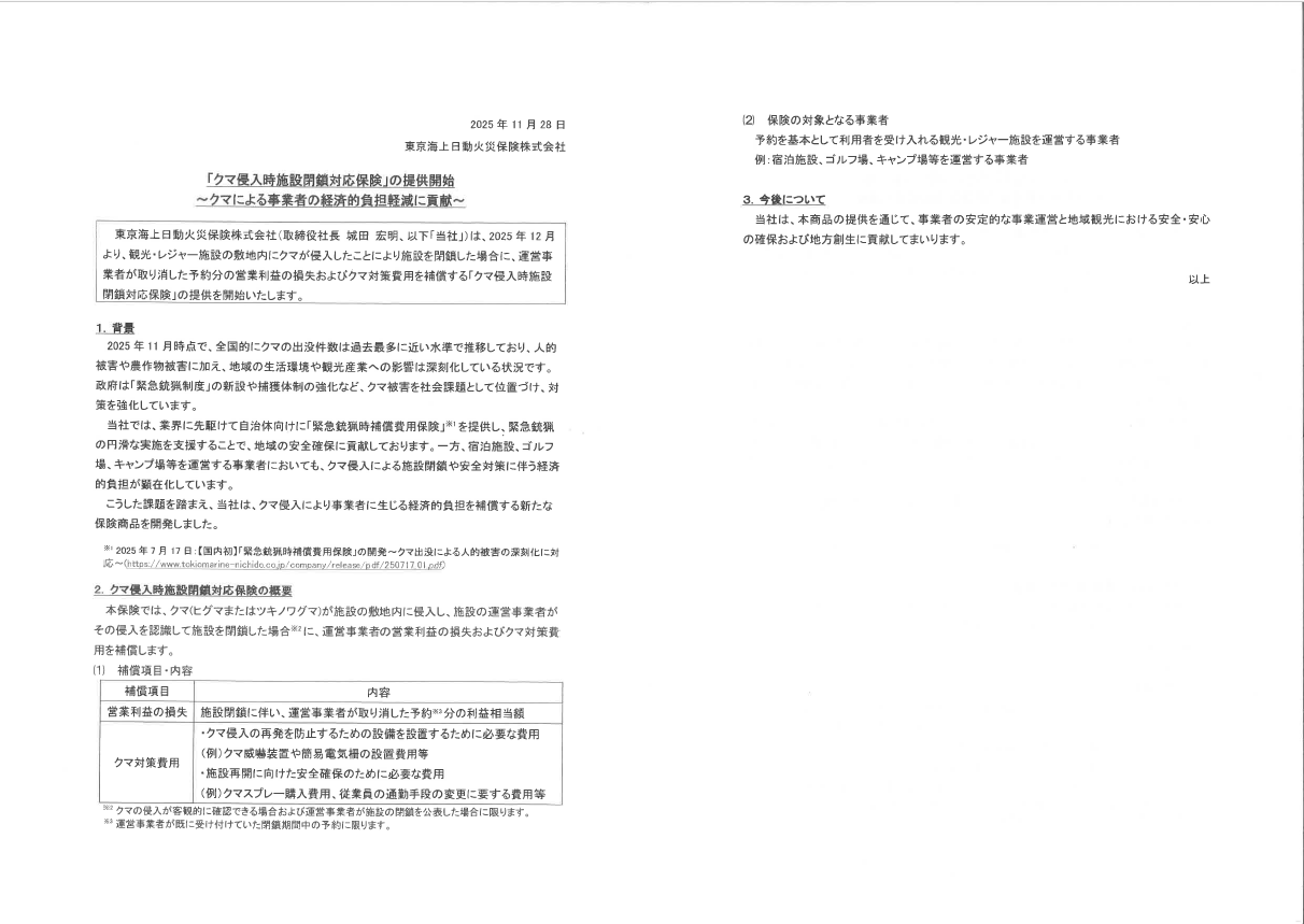 【クマ侵入時施設閉鎖対応保険】の提供開始に関するお知らせー東京海上日動火災保険ー