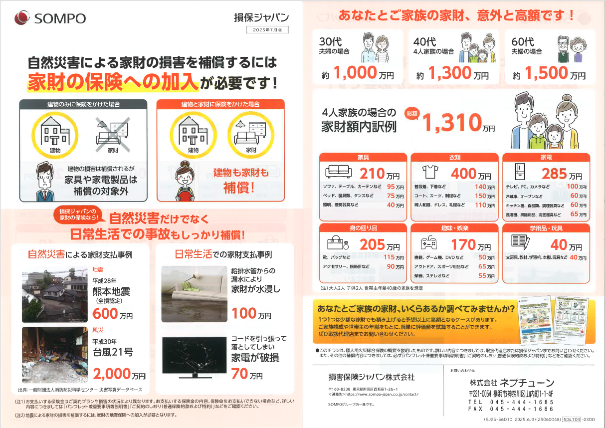 自然災害による家財の損害を補償するには家財保険への加入が必要です!お住まいの火災保険に関するお問い合わせは、弊社までご連絡ください。